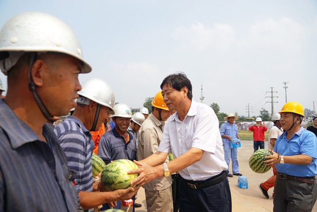 新安县产业集聚区管委会副主任牛志伟一行带着西瓜、矿泉水等防暑降温物品,到万基控股集团