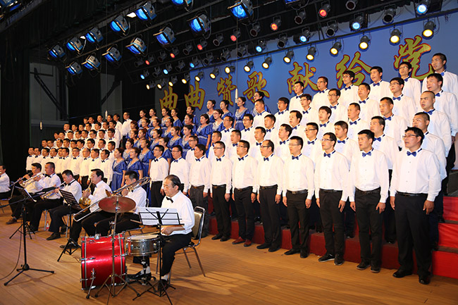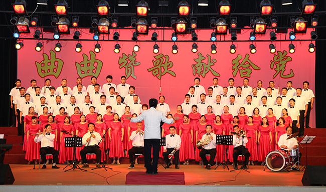最后,集团公司工会副主席贾志成上台指挥,台上队员和台下2000多名观众全体起立,共同唱响《没有共产党就没有新中国》,现场红旗舞动,歌声洪亮,将整台演出活动推向了高潮。